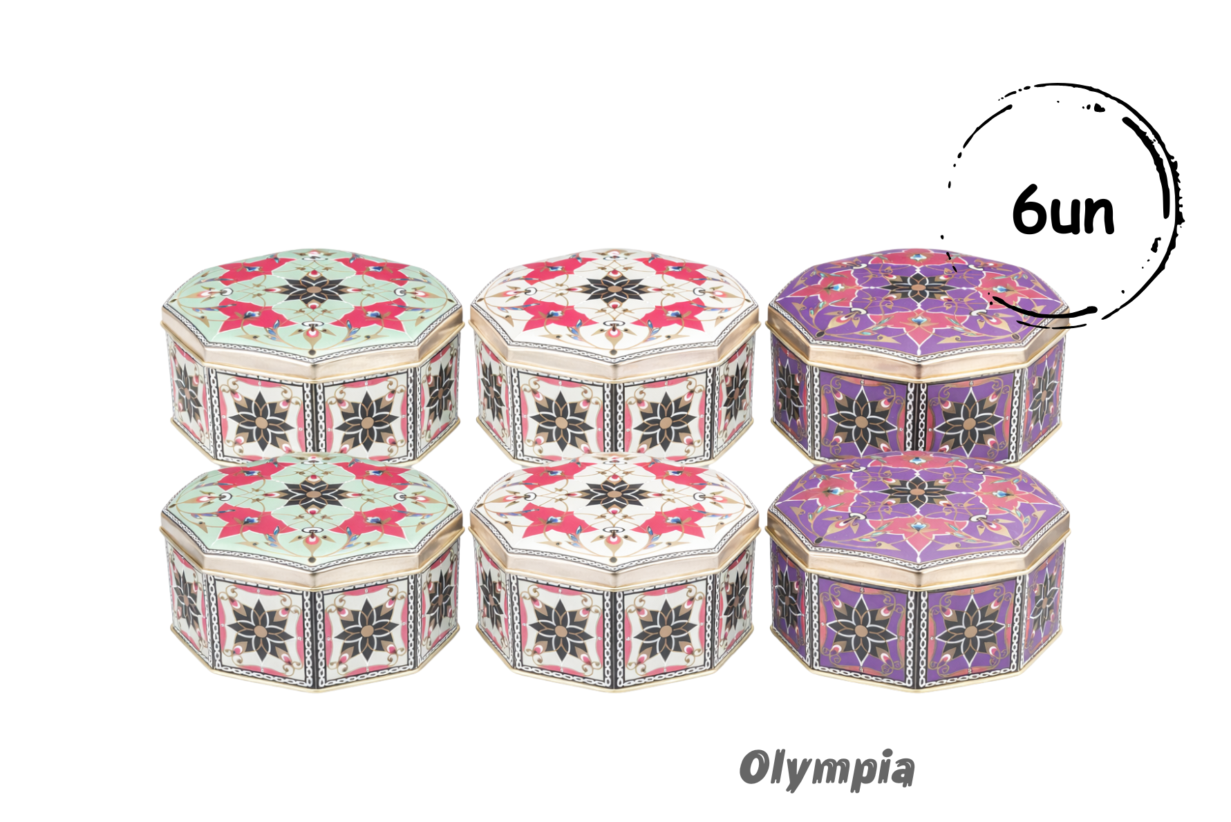 Experimente o luxo discreto da Coleção Taj. Esta lata octogonal, finamente trabalhada, apresenta um design inspirado na arte islâmica, com cores ricas e detalhes intrincados. Uma peça de colecionador que adiciona um toque de sofisticação a qualquer ambiente. Ideal compor kits, armazenar doces, guloseimas, joias ou outros itens valiosos.