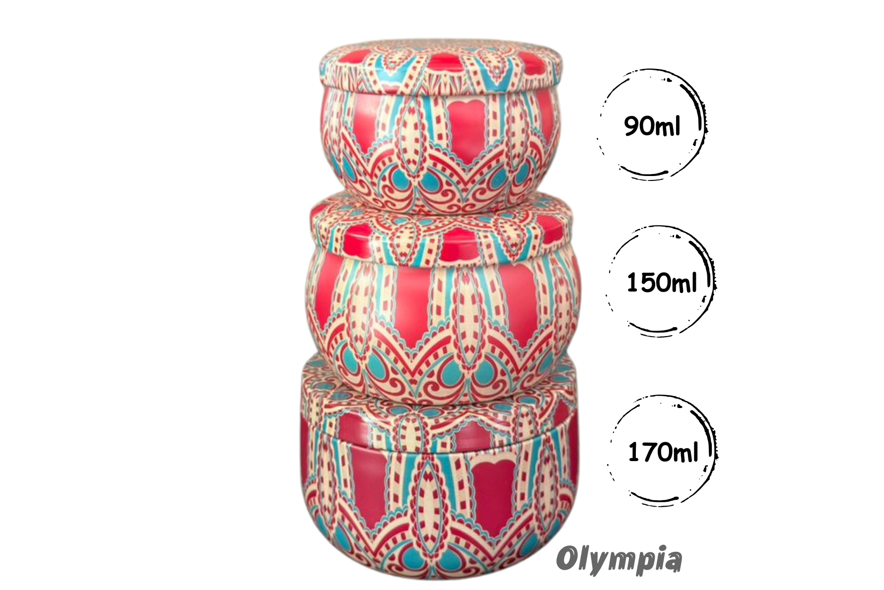 Capacidade Aproximada: 90, 150, 170ml cada lata (Medição feita considerando a densidade da água).