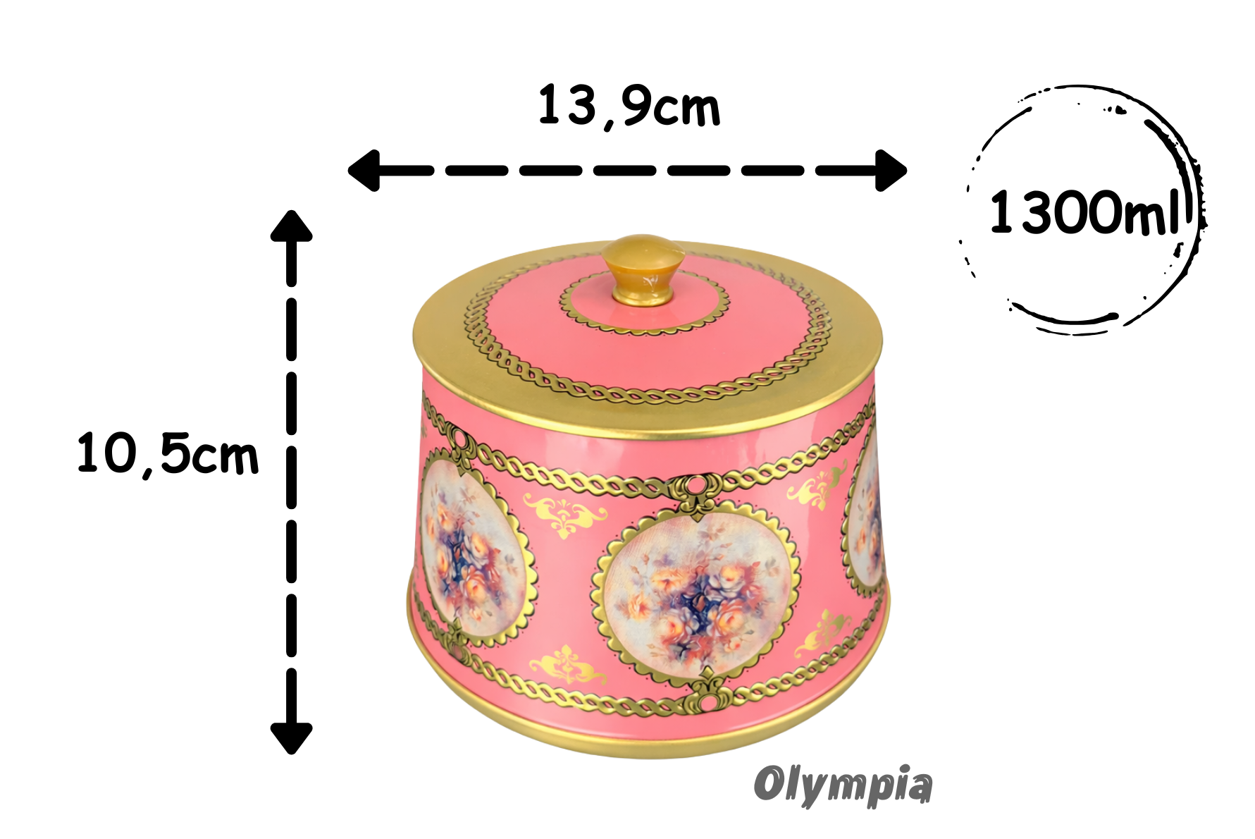 Design Clássico e Elegante: Com um acabamento em tom vermelho e desenhos florais delicados emoldurados por detalhes dourados, esta lata traz um charme nostálgico e atemporal, perfeito para qualquer decoração.
