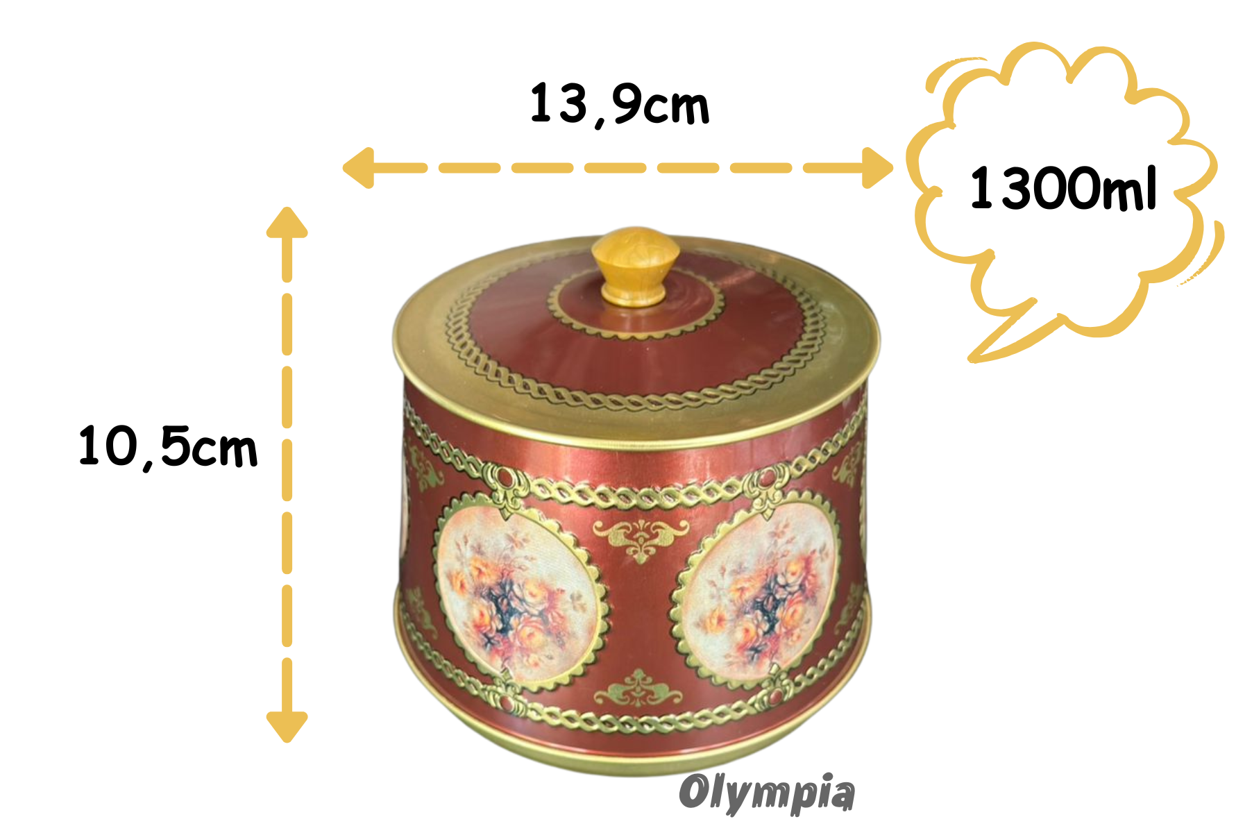 Design Clássico e Elegante: Com um acabamento em tom vermelho e desenhos florais delicados emoldurados por detalhes dourados, esta lata traz um charme nostálgico e atemporal, perfeito para qualquer decoração.