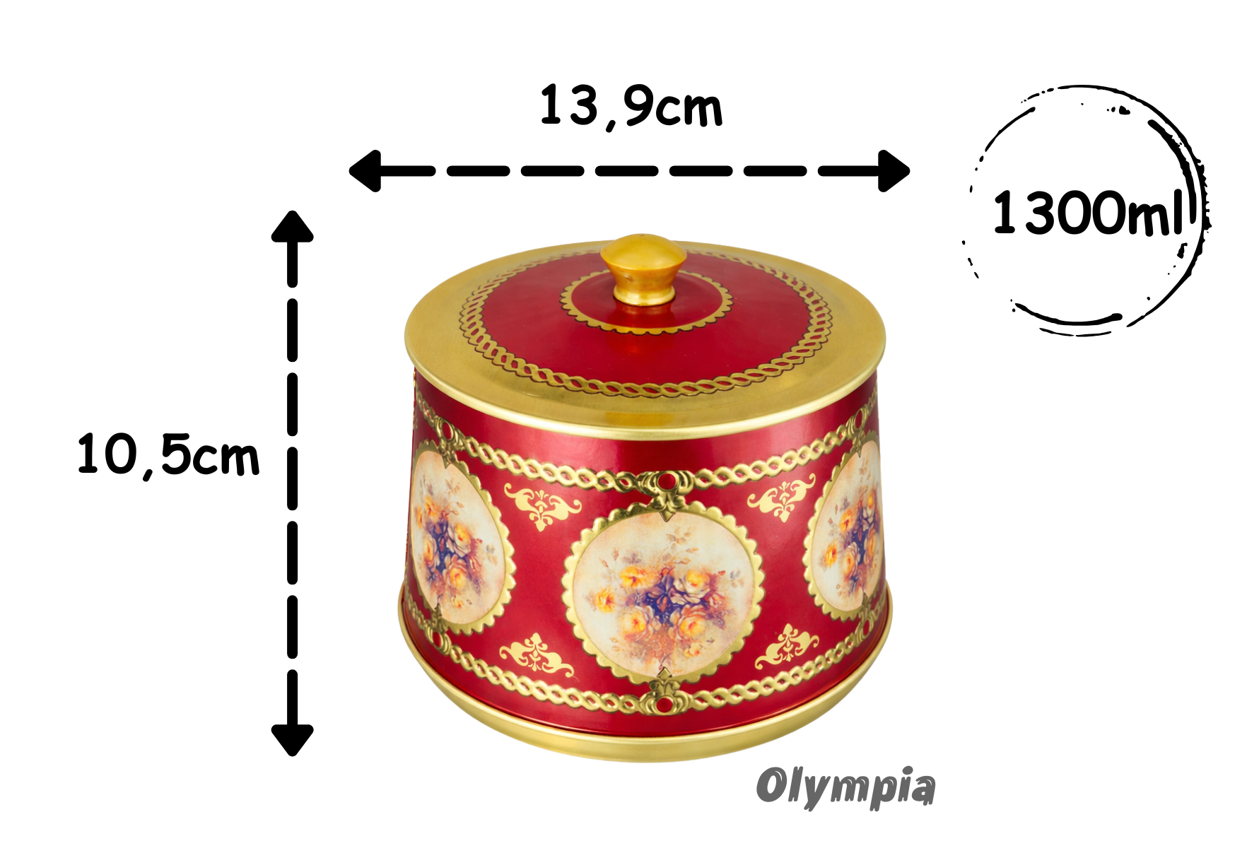 Design Clássico e Elegante: Com um acabamento em tom vermelho e desenhos florais delicados emoldurados por detalhes dourados, esta lata traz um charme nostálgico e atemporal, perfeito para qualquer decoração.